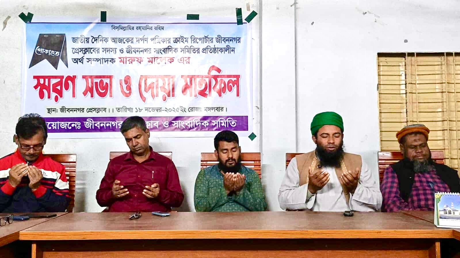 আহাম্মদ সগীর, চুয়াডাঙ্গা প্রতিনিধি : জীবননগরে জাতীয় দৈনিক আজকের দর্পণ পত্রিকার ক্রাইম রিপোর্টার, জীবননগর প্রেসক্লাবের সদস্য ও জীবননগর সাংবাদিক সমিতির প্রতিষ্ঠাকালীন অর্থ সম্পাদক মারুফ মালেকের স্মরণ সভা ও দোয়া মাহফিল অনুষ্ঠিত হয়েছে। মঙ্গলবার মাগরিবের নামাজের পর জীবননগর প্রেসক্লাবে এই স্মরণ সভা ও দোয়া মাহফিলের আয়োজন করা হয়। এর যৌথভাবে এই স্মরণ সভা ও দোয়া মাহফিলের আয়োজন করে জীবননগর প্রেসক্লাব প সাংবাদিক সমিতি।